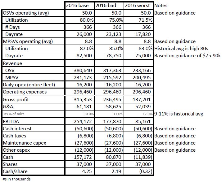 - Dayrate is the biggest variable I’m guessing at. $26,000 base case is the high end of their 2015 dayrate guidance. The $23,123 bad case is the deadweight ton-inflation-adjusted 2011 dayrate (when there was a 6-month moratorium on all GoM drilling). The worst case of $17,820 is daily opex + 10% which seems very unrealistic.