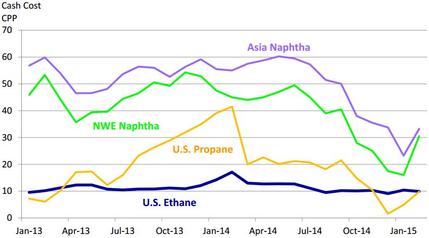 Currently about 70% of domestic ethylene is produced from ethane. European and Asian ethylene is produced mostly from naphtha (because they lack natural gas) which is significantly more expensive than US ethane.