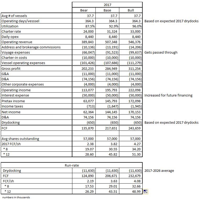 Even though there are a lot of moving parts in this company and industry, valuation is fairly simple. The majority of their expenses are fixed or stable and one of the largest expenses (voyage expenses) is a pass-through that gets added to operating revenue. Therefore, valuation is almost entirely based on utilization and charter rate assumptions. 2017 is when their full pro forma fleet will be operational so that is the year I’ve chosen to value the company. The majority of the expected export terminals will also be up and running by yearend 2017.