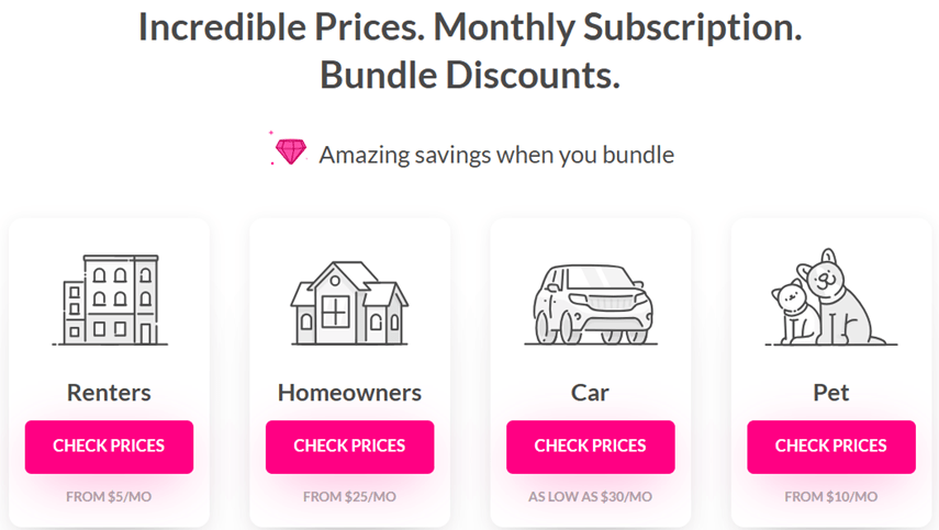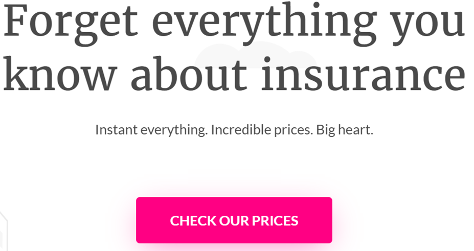 Beyond just the messaging differences, Lemonade puts far more effort into their design and branding. Lemonade created a completely custom art style that is distinctive, memorable, and unique to them. Their color scheme is black, white and grey with very bright pink for emphasis.