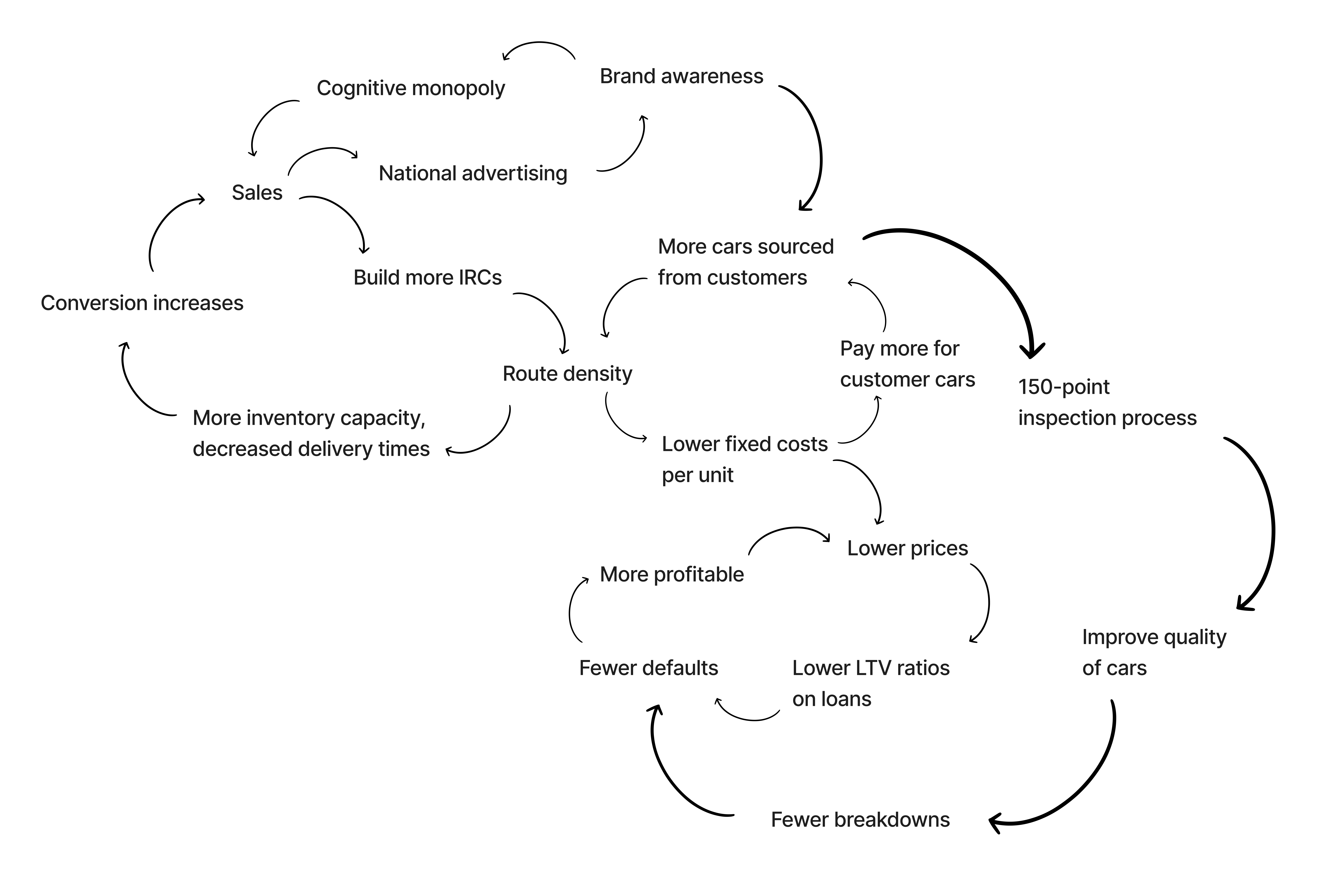 Below is my attempt to visualize Carvana’s numerous flywheels and how they interact and reinforce each other.