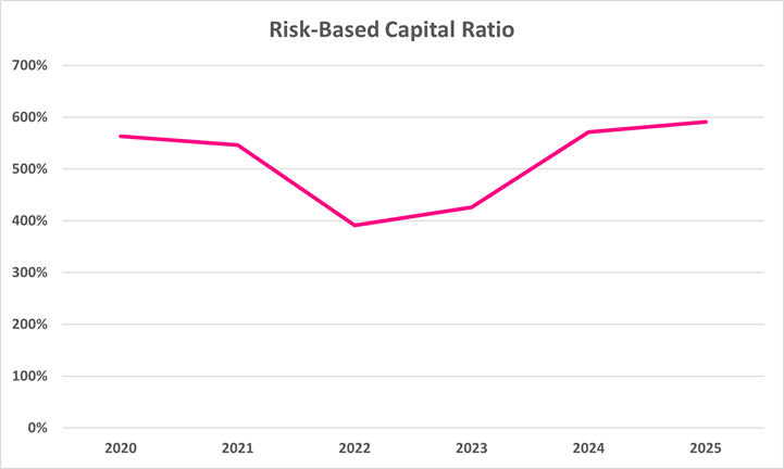 Generally, anything above 300% means regulators are happy and the insurer is nowhere near having regulatory issues. Lemonade far exceeds that 300% threshold, ending 2025 at 591%.